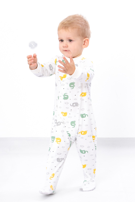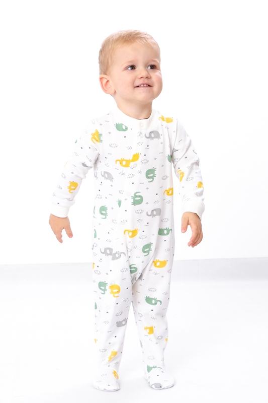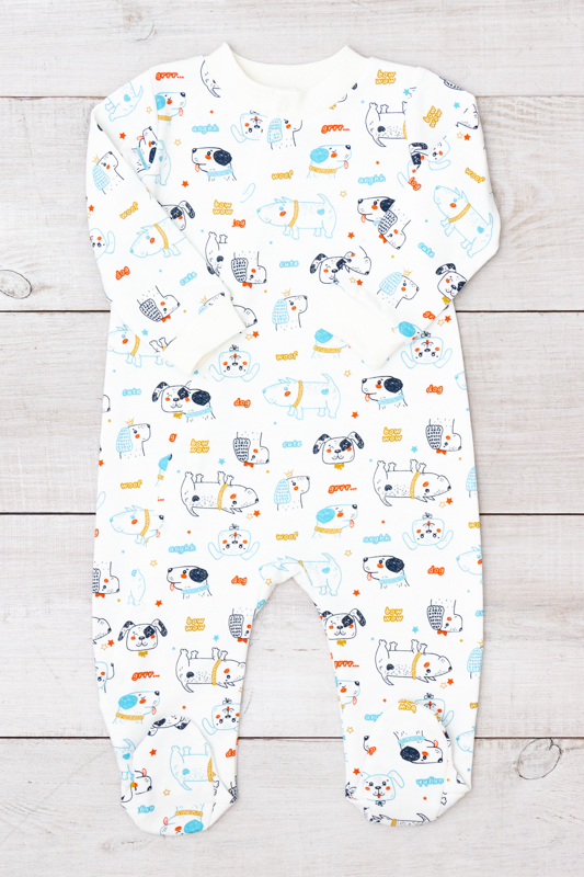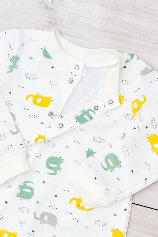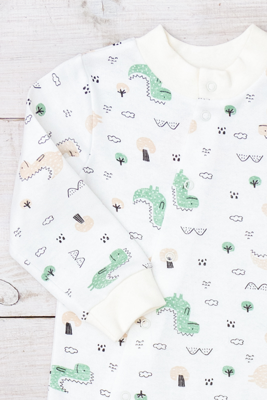 Барвистий дитячий комбінезон, пошитий з набивного начосу. Полотно з виворітного боку має начос, що робить його теплим, дуже м'яким і приємним на дотик. Начос відмінно пропускає повітря і дозволяє шкірі дихати. Горловина і манжети, можуть бути оброблені рубчиком або стрейчем. Виріб застібається на кнопочки по всій довжині. Прати при температурі не більше 30 ° C, дає усадку на 1-2 см. На окрему увагу заслуговує принт комбінезона - дуже яскравий і барвистий.