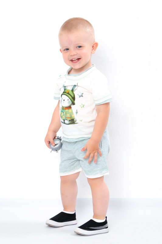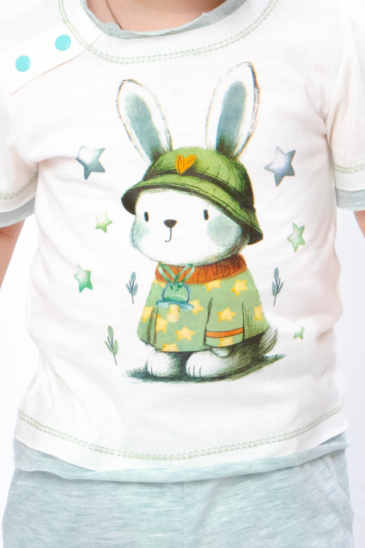 Комплект ясельний для хлопчиків складається з футболки та шортиків. Пошитий з натурального бавовняного полотна – однотонний кулір, яке не викликає подразнень на шкірі малюка. Футболочка має круглу горловину, спереду нанесений милий принт зайченятка. Шортики на резинці, по бокам є дві кишені. Полотно гарної якості, після прання не линяє і не розтягується. Чудово підходить для щоденного використання в теплу погоду.