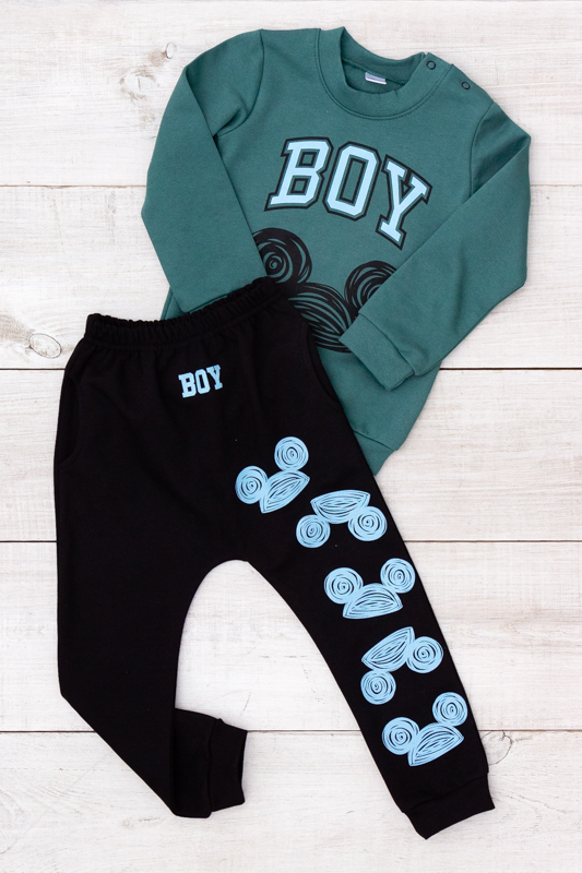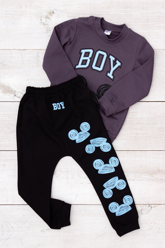 Милий та зручний ясельний комплект для хлопчика, виготовлений з натуральної бавовни. Комплект включає кофту з довгими рукавами, що застібається на дві кнопки, та штани з кишенями, які забезпечують комфортну посадку. Милий принт на виробі надає моделі ніжності та грайливості, роблячи її ідеальною для повсякденного носіння. Завдяки натуральній тканині, комплект дихає і підходить для чутливої дитячої шкіри.
