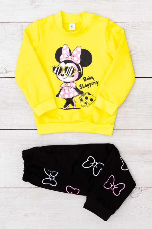 Штани доповнюють комплект стильними принтами, що додають яскравих акцентів і роблять його ще більш привабливим для маленьких дівчаток. М'яка гумка на поясі не тисне і легко адаптується до тіла, забезпечуючи зручність та свободу рухів. Класичний прямий крій дозволяє дитині рухатись без обмежень, а практичний матеріал легко витримує активний спосіб життя.
