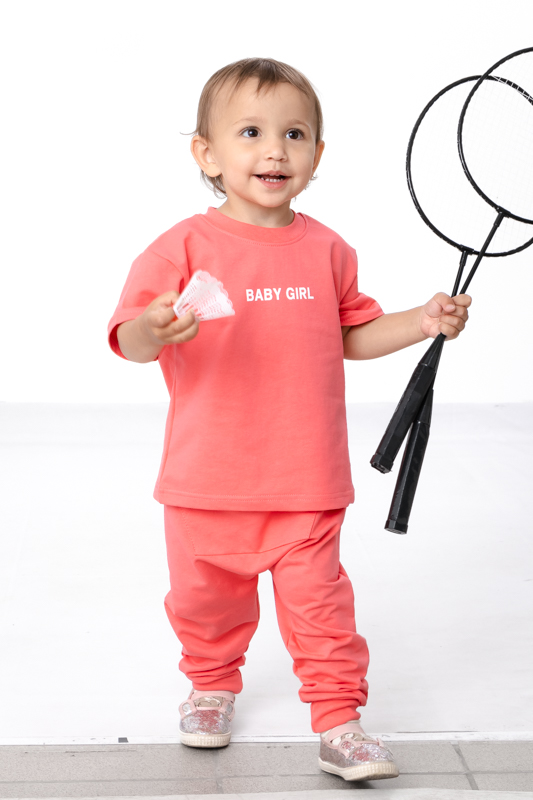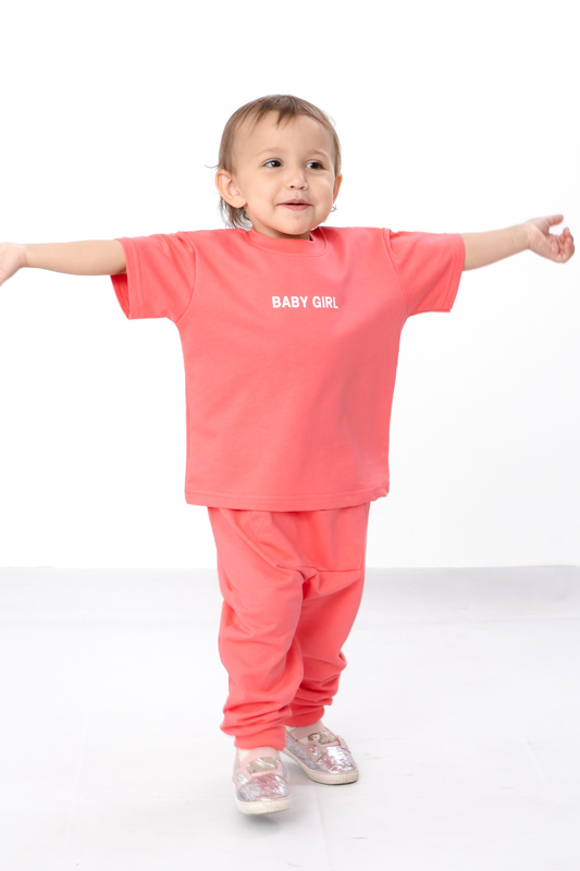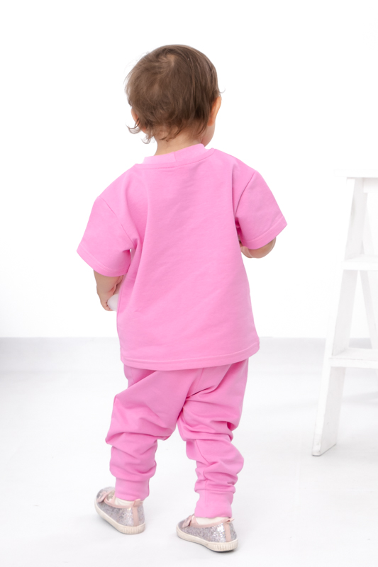 Футболка має вільний крій, що не сковує рухів, та зручну горловину, яка легко одягається навіть на найменших. Штани з м’яким поясом на резинці не тиснуть на животик і добре тримаються, а зручна довжина дозволяє використовувати комплект як удома, так і на прогулянці.