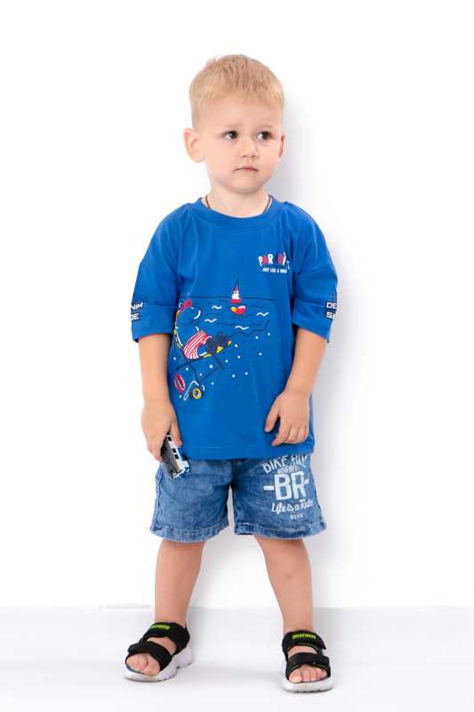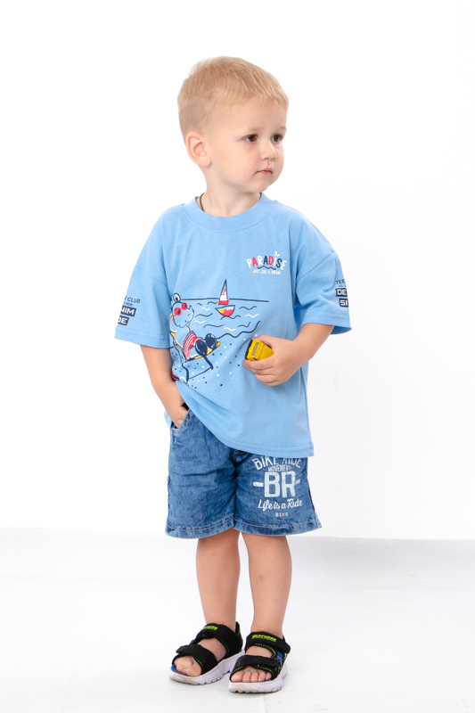 Футболка має класичний фасон з короткими рукавами та округлою горловиною, що забезпечує легке одягання та комфортну посадку. Завдяки вільному крою, виріб не сковує рухів, дозволяючи дитині вільно рухатися та гратися протягом усього дня. Яскравий або тематичний принт на грудях додає моделі веселого, сучасного вигляду, що неодмінно сподобається малюкові.