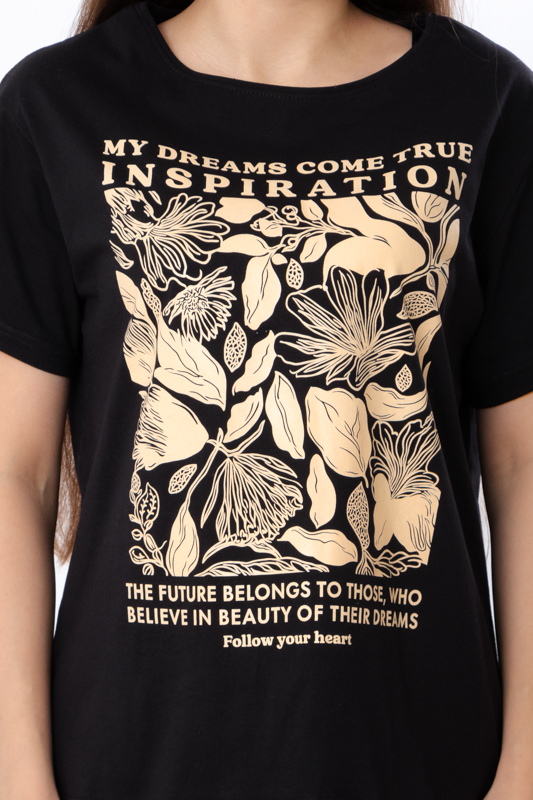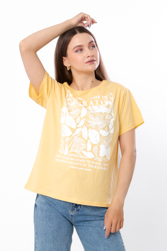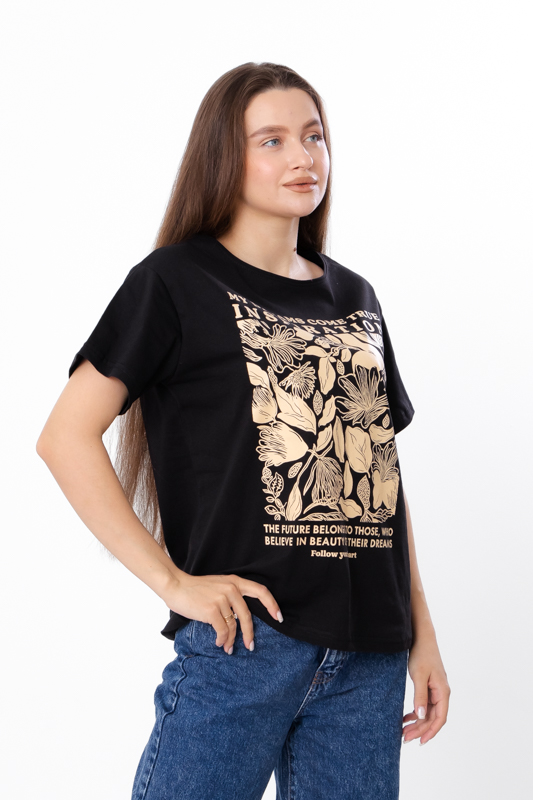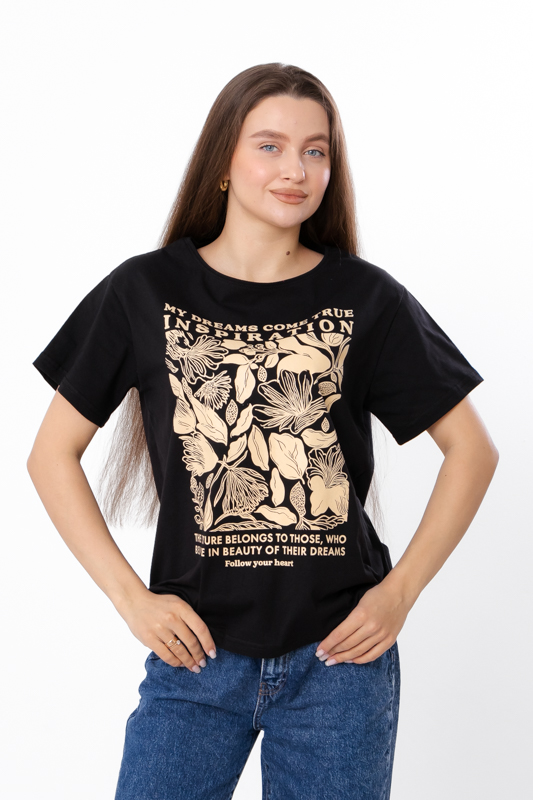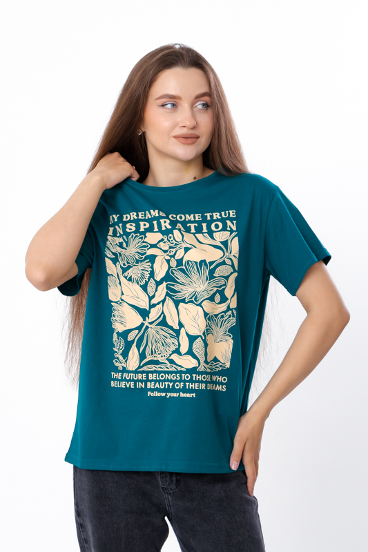 Футболка жіноча оверсайз пошита з легкого трикотажного полотна – кулір. Модель вільного крою, з короткими рукавами та округлим вирізом. Лінія плечей спущена. Спереду нанесений стильний квітковий принт. Полотно гарної якості, має натуральний склад, легке - ідеальний варіант для літа. Може давати невелику усадку після прання. Футболку можна поєднувати з джинсами або шортами.