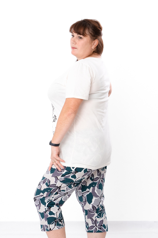 Комплект жіночий складається з двох предметів - футболка та бриджі. Футболка з коротким рукавом та милим рослинним принтом спереду. Бриджі довжиною за коліно, на талії широка резинка. Комплект виконано з натуральної трикотажної тканини високої якості (кулір - 100% бавовна). При пранні може давати невелику усадку.