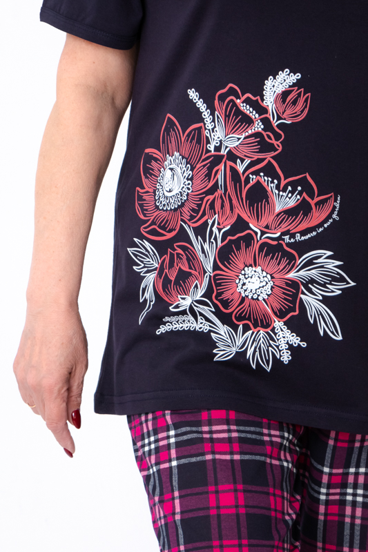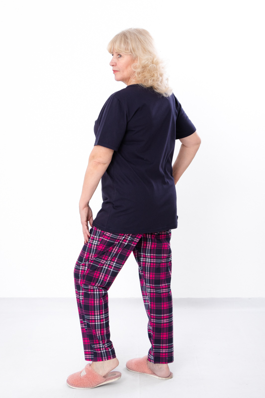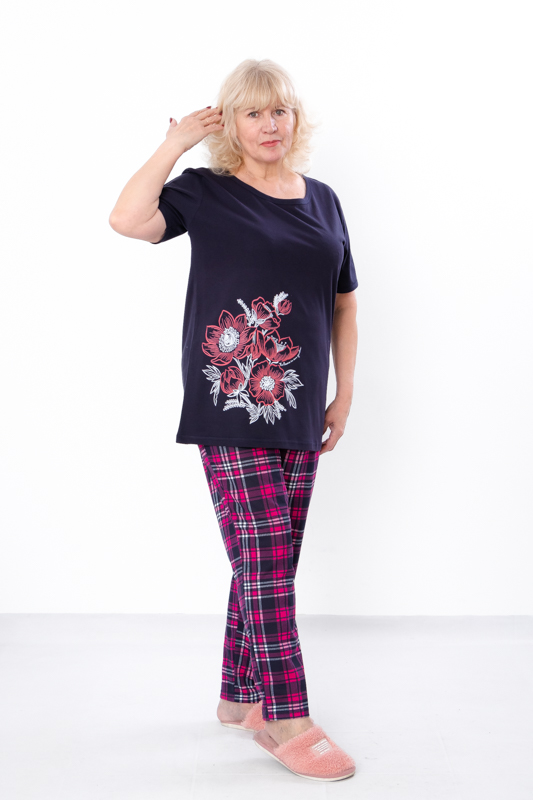 Красива серія бавовняних жіночих комплектів для сну і домашнього відпочинку - серія батал (сезон - літо, осінь-весна). Комплект складається з двох предметів - футболки і брюк. Футболка з коротким рукавом і барвистим принтом по переду, брюки вільного крою, на талії широка резинка. У виробництві цієї серії комплектів використовується натуральна трикотажна тканина високої якості (кулір - 100% бавовна). Завдяки високому вмісту бавовни, виріб чудово сприймається тілом. У такій піжамі вам буде дуже затишно. Цей комплект оцінять ті дівчата і жінки, які знають всі переваги натурального трикотажу. І при цьому хочуть купити гарну, модну і стильну річ.