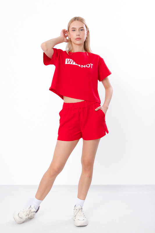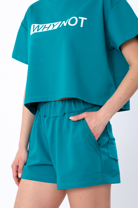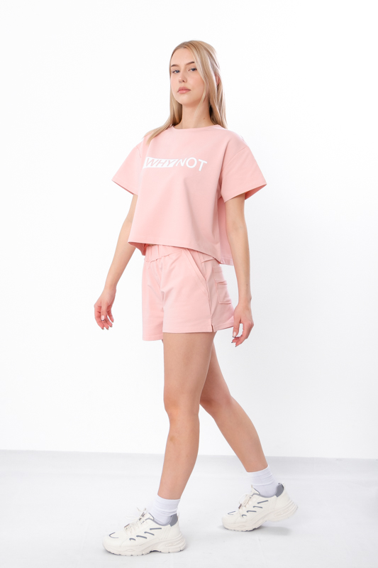 Цей жіночий комплект, що складається з укороченої футболки з принтом і зручних шортів вільного крою з кишенями, створений для тих, хто шукає легкий, модний і комфортний варіант на кожен день. Образ поєднує актуальні тренди та практичність, тому стане улюбленим у вашому гардеробі в теплу пору року.