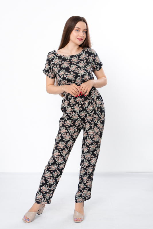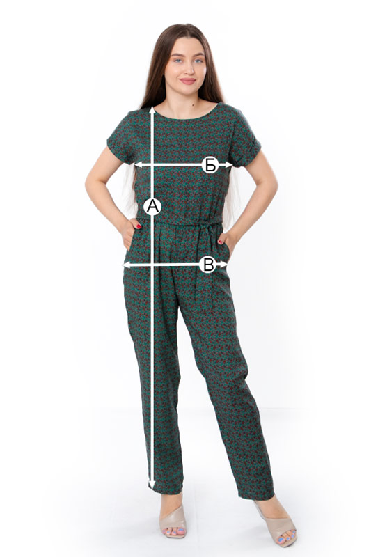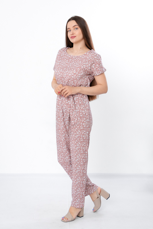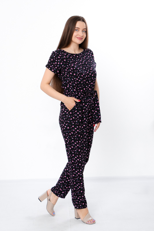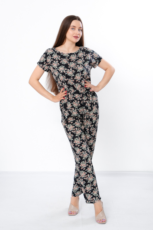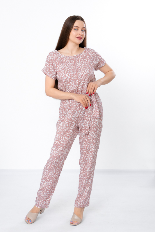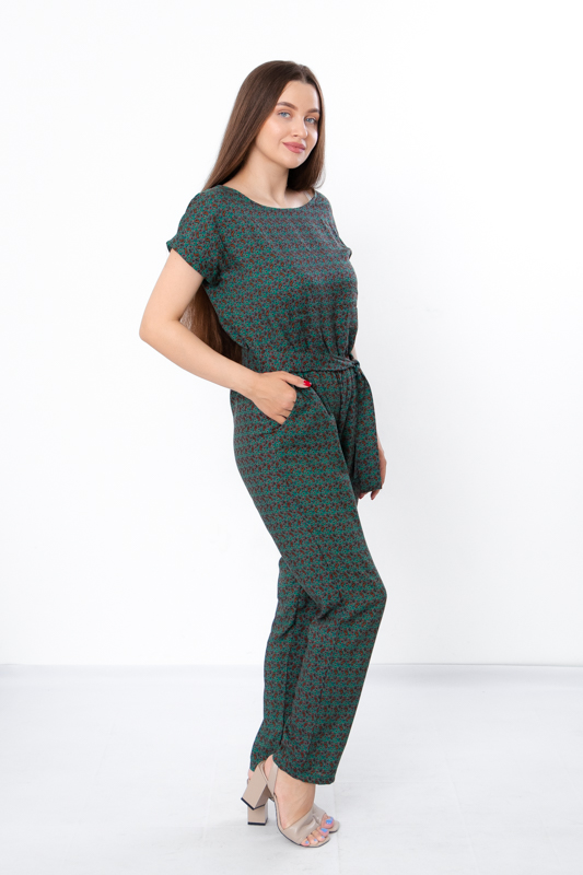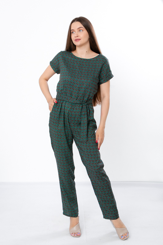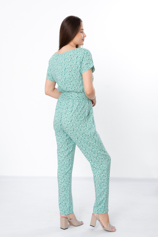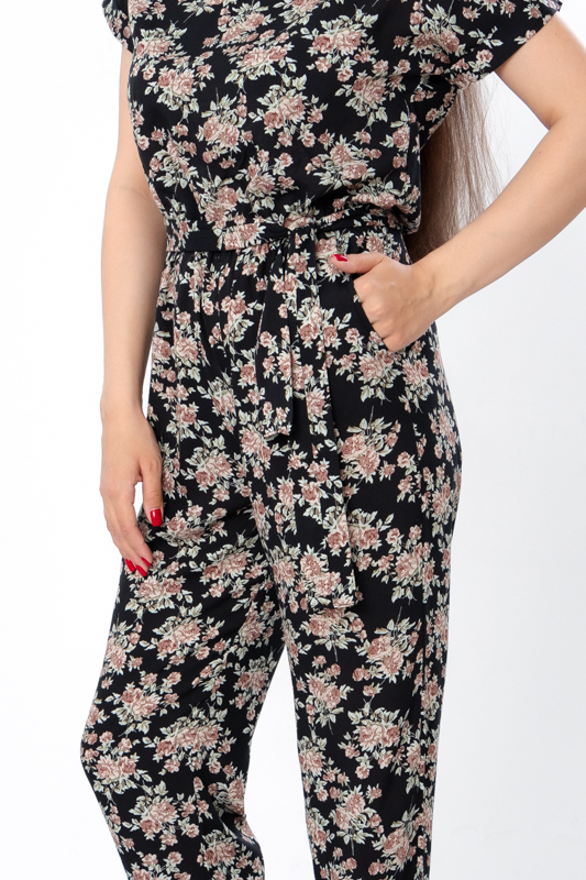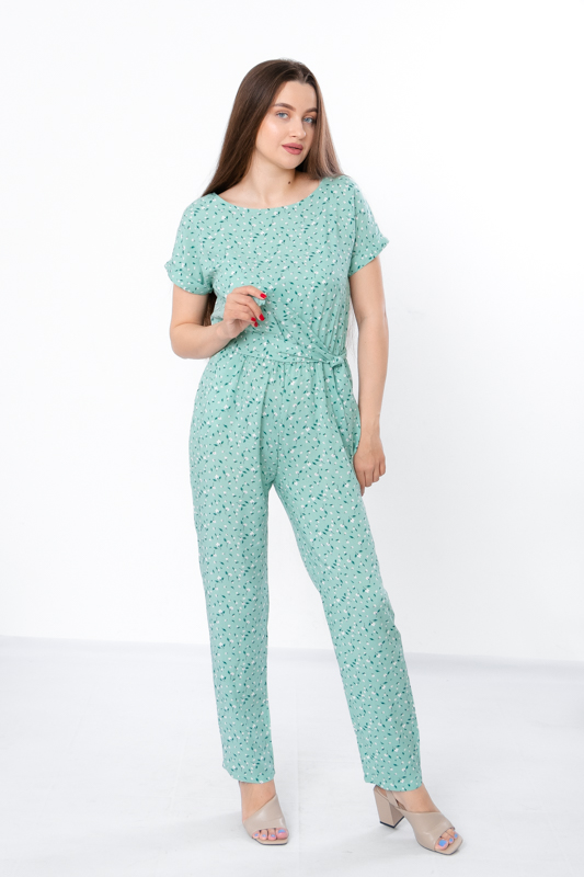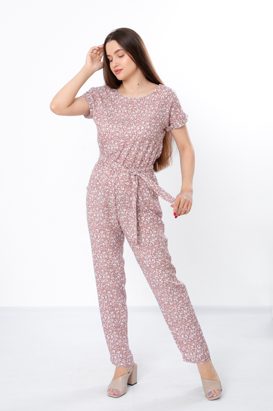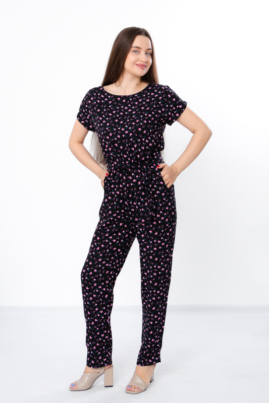 Жіночий комбінезон виготовлений з ніжного полотна - штапель, що забезпечує комфорт та легкість у спекотні літні дні. Його фасон ідеально підкреслює жіночу фігуру, забезпечуючи свободу руху. Комбінезон має округлу горловину та короткі рукава, по бокам є дві кишені. Також є пояс, що підкреслює талію. По лінії талії також вшита резинка. Комбінезон підходить для різних випадків - для повсякденного носіння та вечірніх прогулянок.