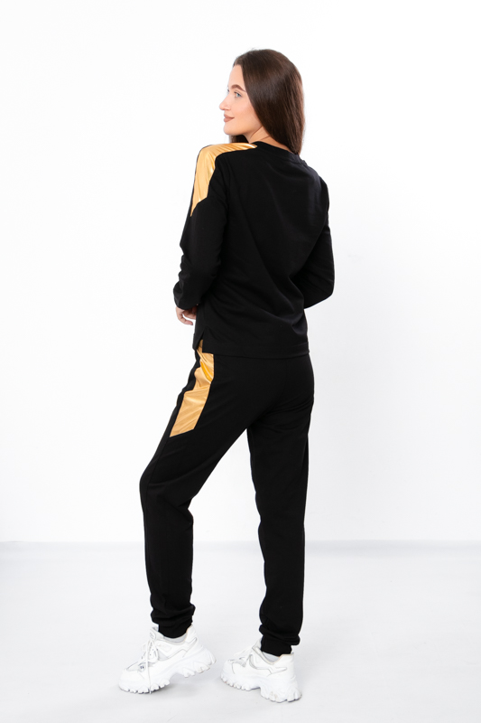 Зустрічайте ідеальне поєднання комфорту та розкоші! Цей стильний костюм виконаний у глибокому чорному кольорі з ефектними золотистими деталями. М’яка та приємна до тіла тканина дарує максимальний комфорт, а вільний крій додає легкості та свободи рухів.Завдяки витонченому поєднанню чорного кольору з золотими акцентами цей комплект стане улюбленою річчю у твоєму гардеробі!