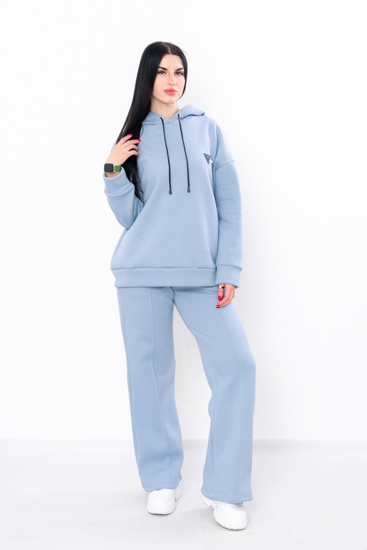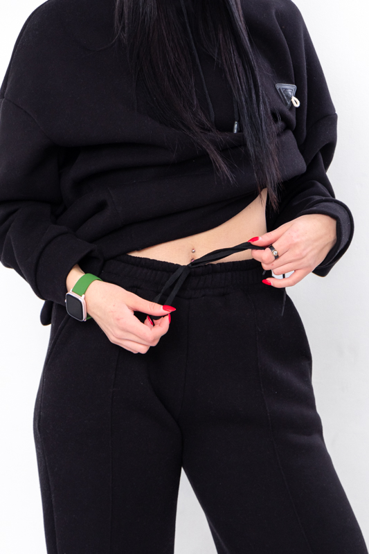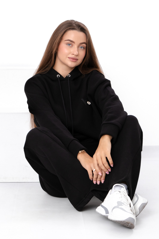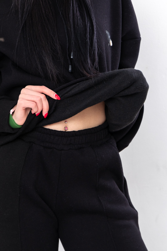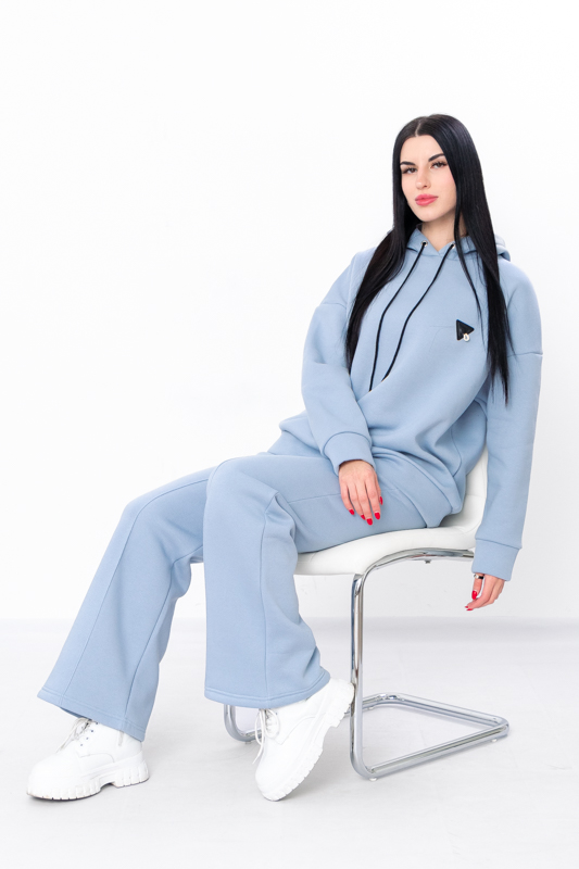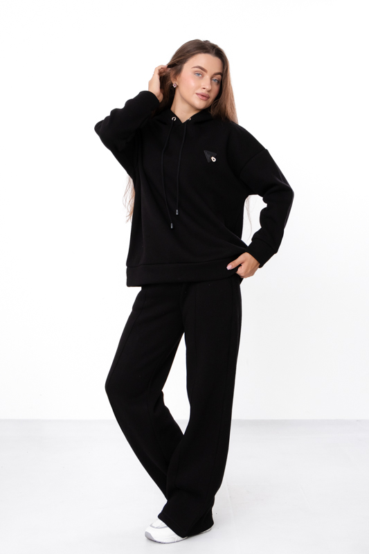 Худі з капюшоном, декорований нашивкою по переду виробу, рукава та низ на манжетах з основного полотна. Штани-палаццо з високою посадкою, зі стрілками по переду, мають дві кишені, широку резинку на поясі, для зручності в пояс вставлений шнурок.