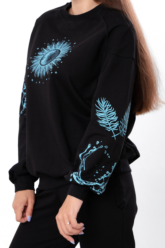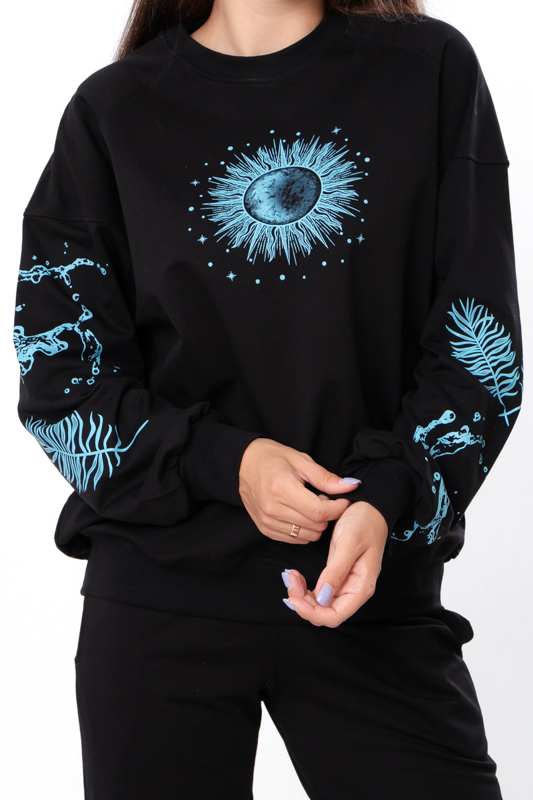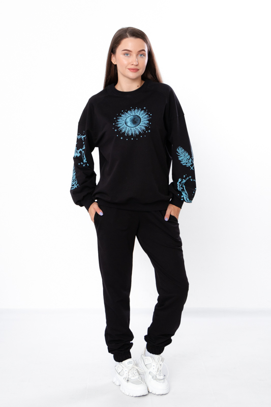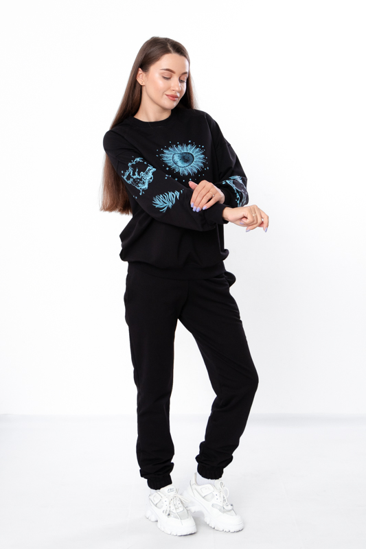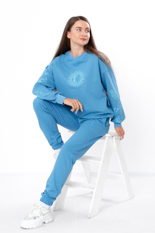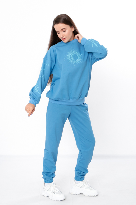 Стильний та зручний костюм складається з джемперу та штанів. Джемпер має вільний крій, округлу горловину, лінія плечей спущена. Штани на широкій резинці з кишенями по бокам. Знизу на штанах манжети з резинкою. В якості декору костюм прикрашено стильним та якісним накатом. Костюм пошитий з однотонної двонитки. Полотно гарної якості. Тому, при правильному догляді, його можна буде носити не один сезон. Може давати усадку після прання.