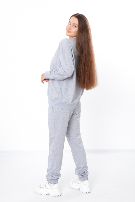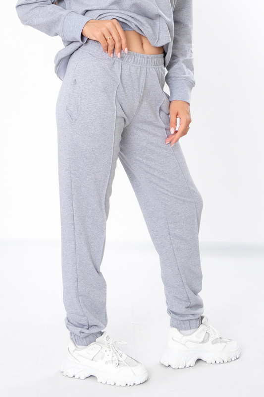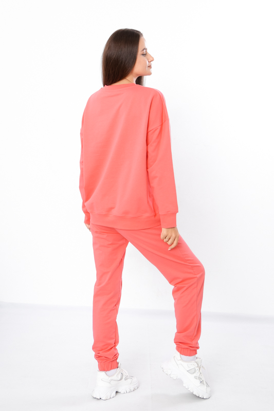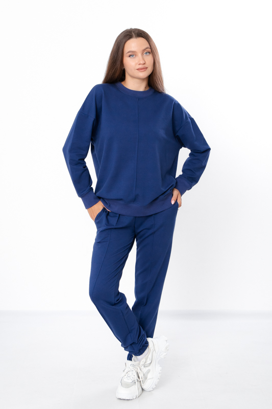 Костюм жіночий виконан з однотонної двонитки. Складається з джемперу та штанів. Джемпер з довгими рукавами на манжетах та округлою горловино. Штани прямого крою, по бокам є дві кишені, знизу манжети на резинці. Костюм чудово підійде на прохолодну погоду. Полотно гарної якості. Тому, при правильному догляді, костюм можна буде носити не один сезон. Може давати усадку після прання.