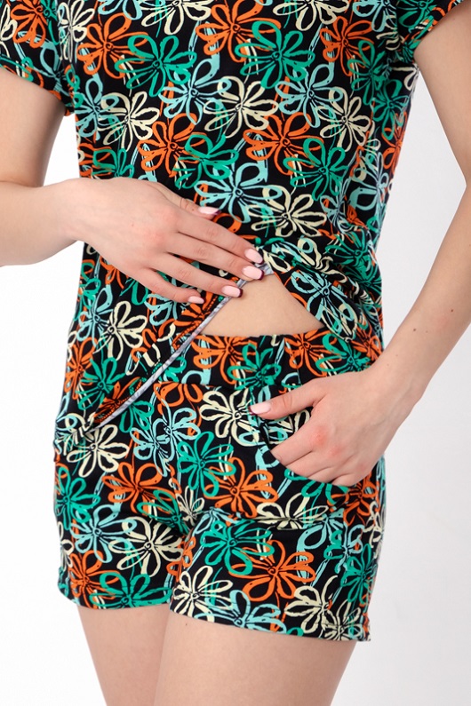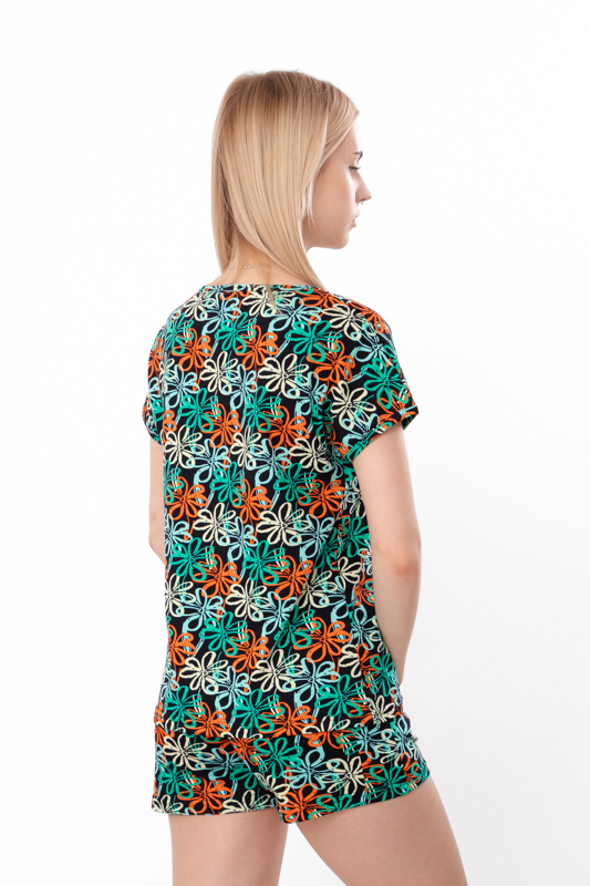 Легка літня піжама для жінок із куліру. Модель має вільний крій. Складається з футболки з короткими рукавами та шортів. На шортах є кишені по боках. Полотно має натуральний склад, тому при пранні може дати невелику усадку.