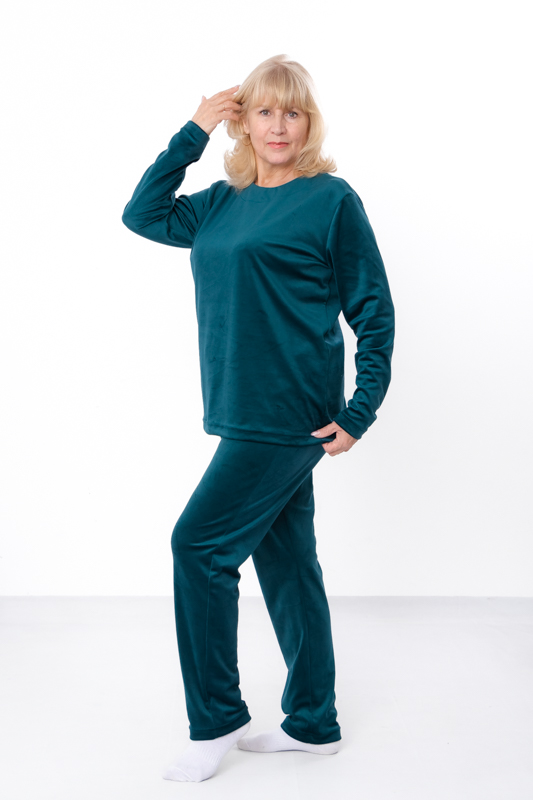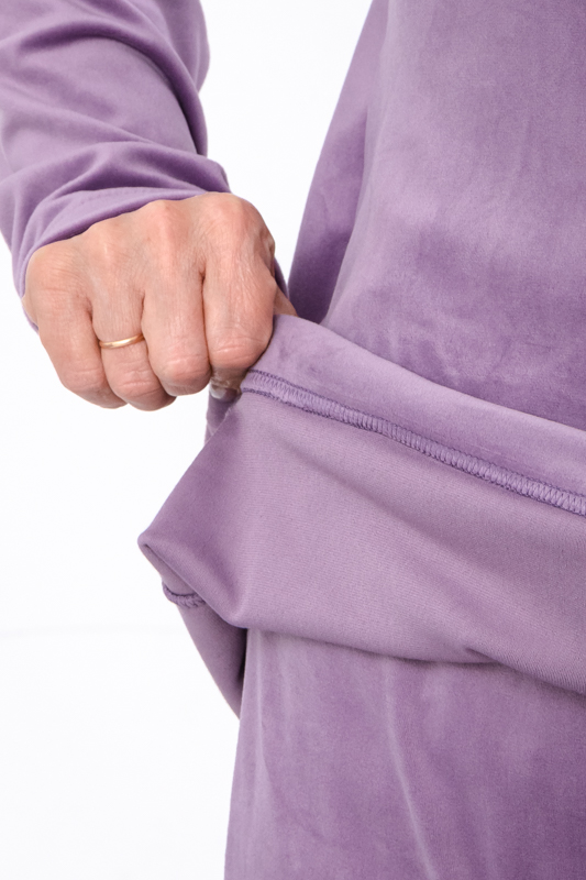 Особливу увагу привертає саме тканина — велюр плюш, відомий своєю розкішною м’якістю, легким блиском та делікатною текстурою. Він приємний до тіла, не подразнює шкіру та створює відчуття ніжного огортання. Велюр добре тримає форму, не витягується після прання та зберігає насиченість кольору, тому комплект довго виглядатиме як новий. Це один із найпрактичніших варіантів для прохолодного сезону: тканина утримує тепло, але водночас дозволяє шкірі дихати, забезпечуючи комфорт протягом усього дня.