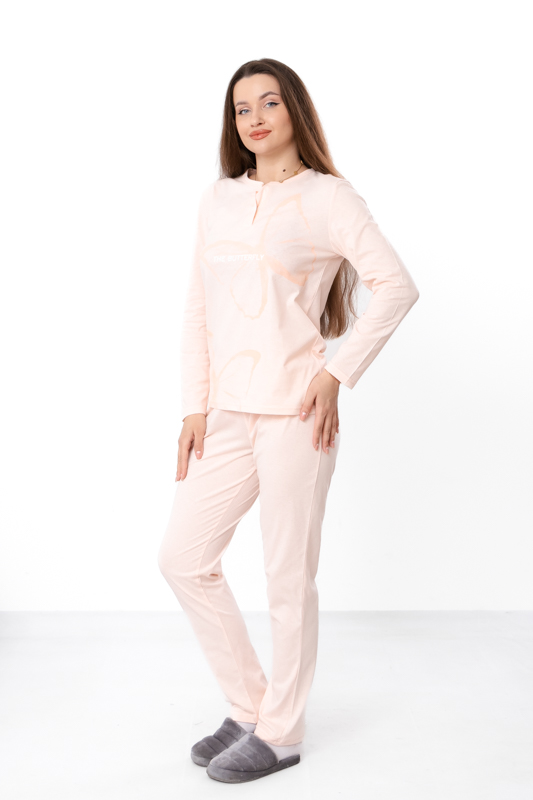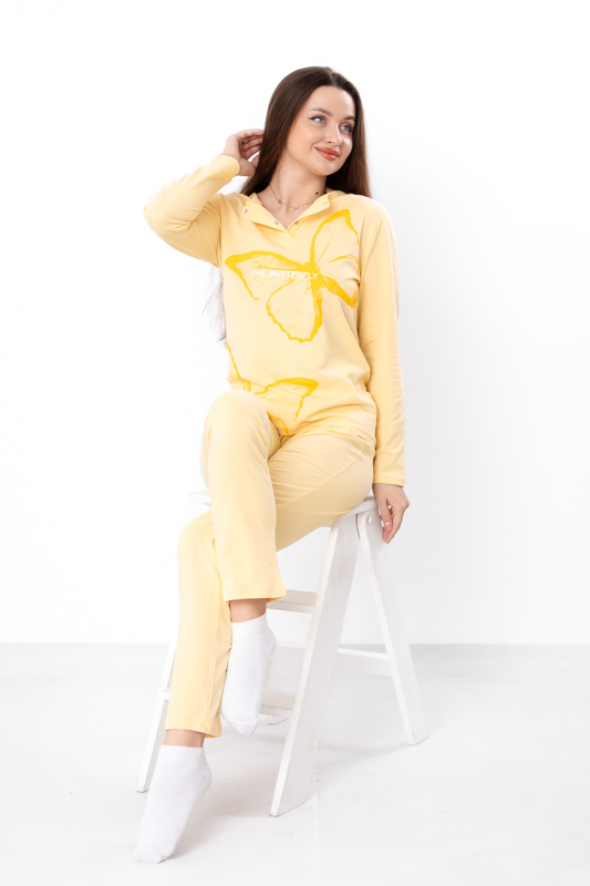 Ця піжама з куліру з накатом метеликів – не тільки зручна, але й надзвичайно стильна. Кнопки на воротнику додають витонченості, а без манжетів вона дарує свободу рухів і комфорт у будь-яку пору року.Ідеальний варіант для спокійних вечорів вдома.М'яка тканина дарує комфорт, а стильний дизайн додає вишуканості вашим вечорам.