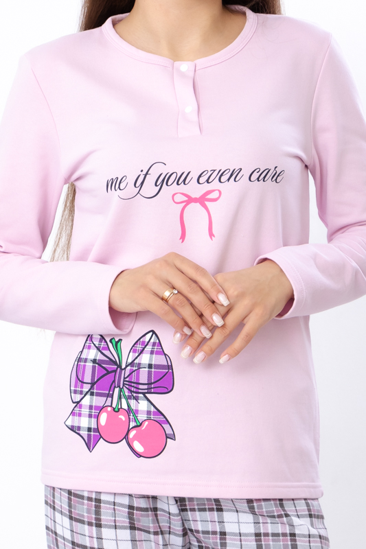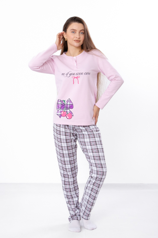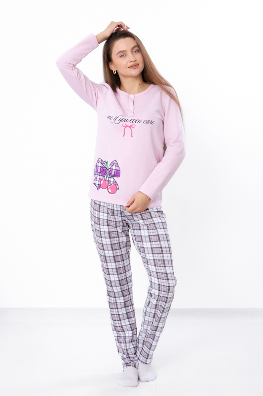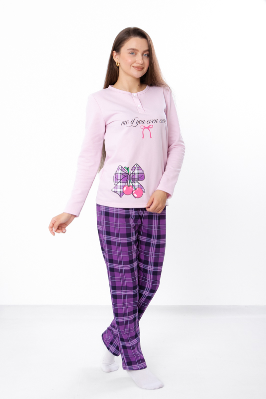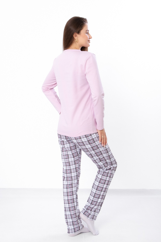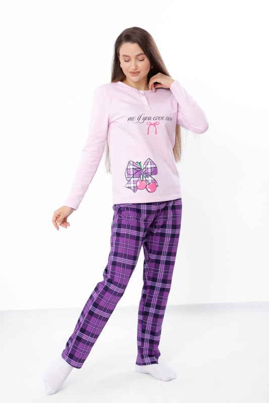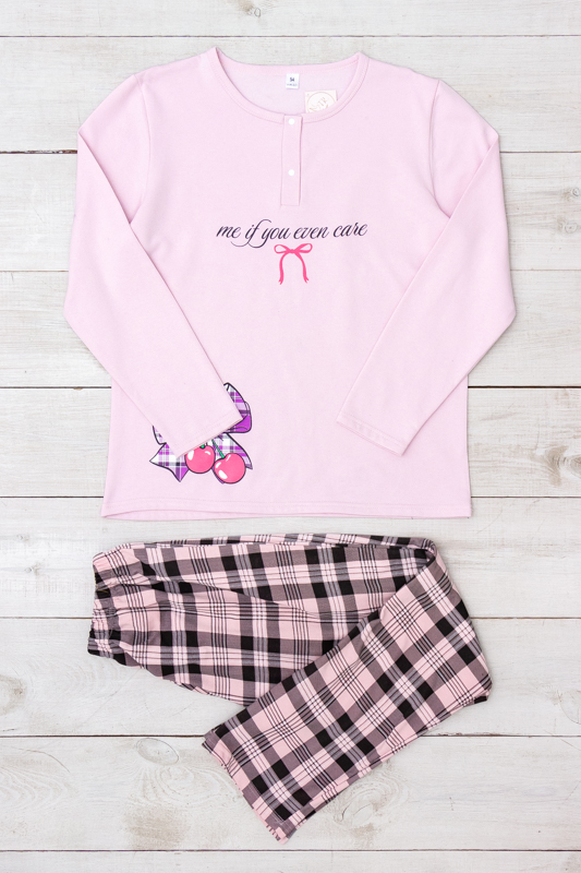 Жіноча піжама зі штанами виконана з якісної та м'якої 100% бавовни. Легке, ніжне полотно, що дихає, не скочується і не деформується при носінні. Затишна піжама складається з футболки з довгим рукавом та піжамних штанів. Зручні штани на гумці не обмежать руху навіть під час активної гри з дитиною чи прибирання. У цій піжамі ви виглядатимете гарно в домашній обстановці. Домашній одяг для жінок – річ, яку хочеться отримати у подарунок. Розмірна сітка містить великі розміри.