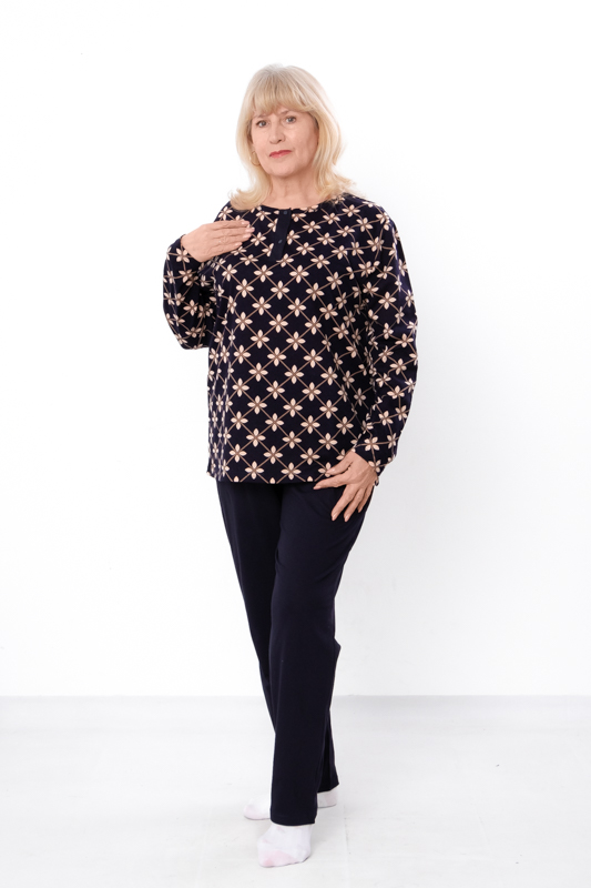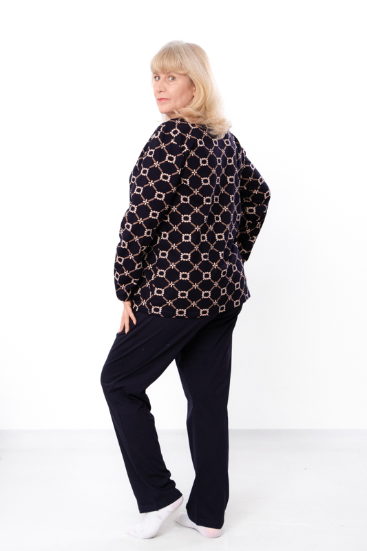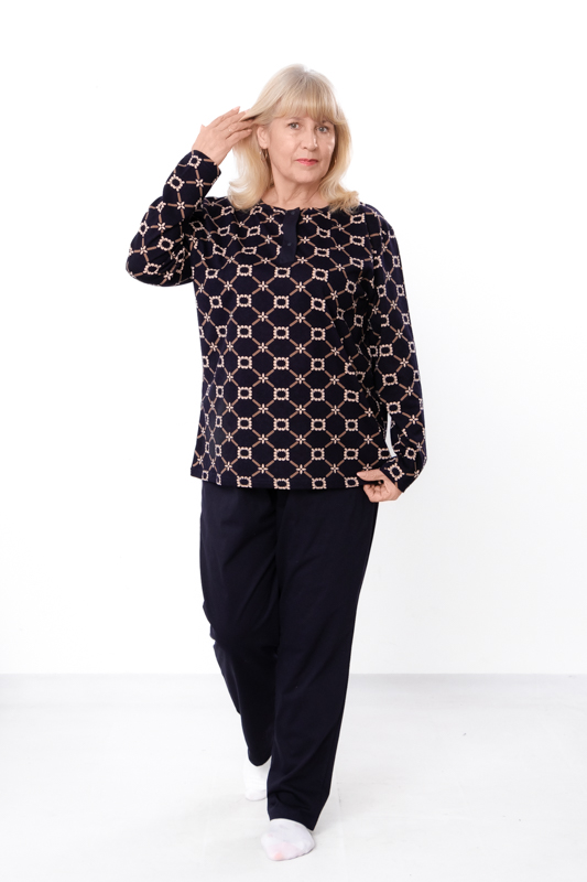 Комплект складається зі штанів і кофти, які гармонійно доповнюють одне одного. Верх виконаний у стриманому дизайні , що додає образу індивідуальності та м’якості. Кофта має зручний крій, який не сковує рухів, забезпечуючи максимальний комфорт під час сну або відпочинку вдома. Вона приємно прилягає до тіла, створюючи відчуття затишку та тепла без зайвого обтяження.