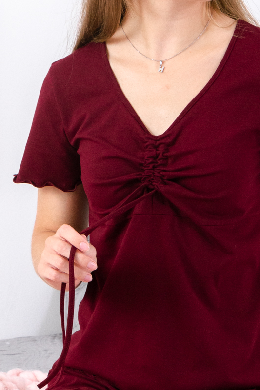 Футболка виконана у вільному силуеті з вертикальною зав’язкою спереду, яка виконує декоративну функцію та водночас дозволяє легко регулювати посадку. Такий дизайнерський елемент додає образу динаміки та молодіжного шарму. Стандартний крій підкреслює талію та гармонійно поєднується з лаконічними шортами.