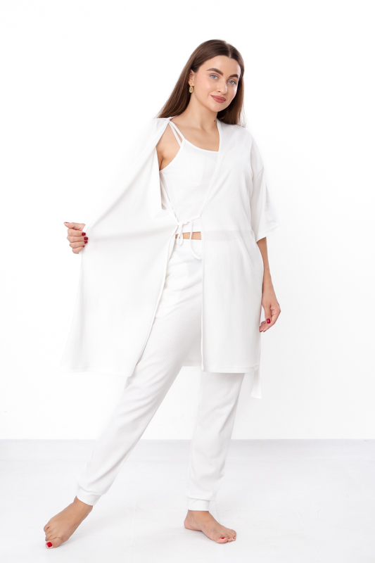 Комплект, що складається з халата, топа та штанів, створений для жінок, які цінують зручність і водночас прагнуть залишатися стильними навіть удома. Завдяки сучасному крою та гармонійному поєднанню елементів він виглядає лаконічно, але водночас витончено, що дозволяє використовувати його не тільки як домашній одяг, а й як стильний варіант для відпочинку чи подорожей.