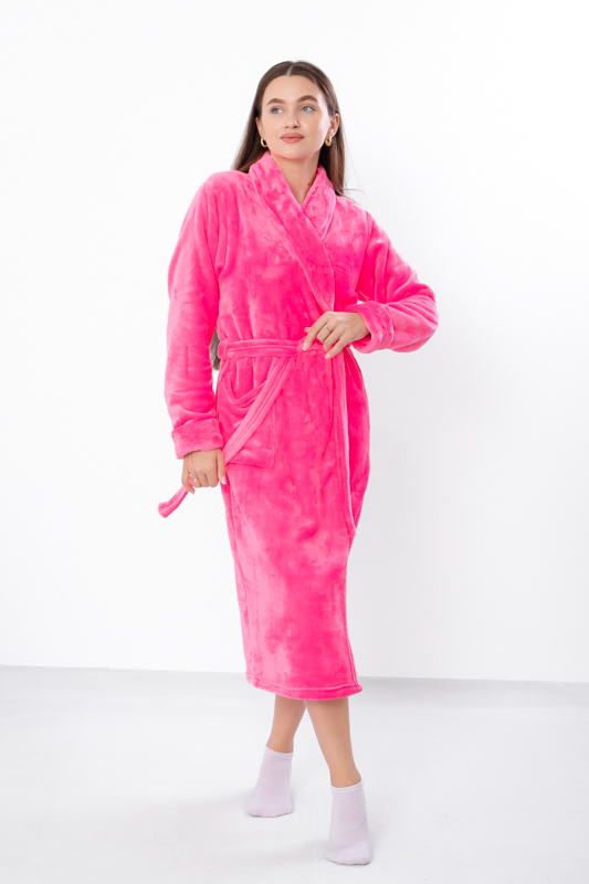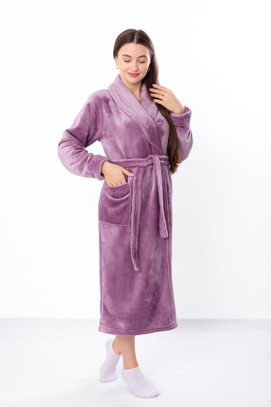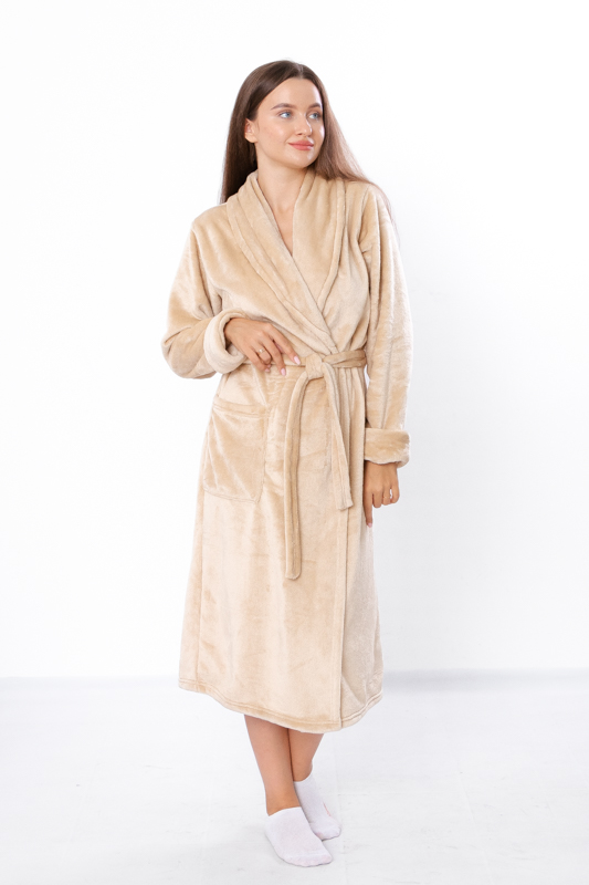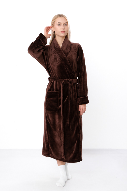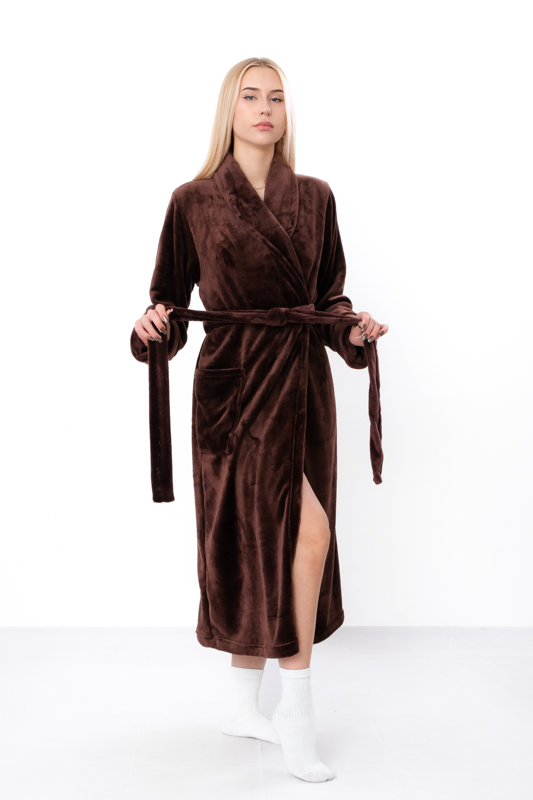 Дуже теплий жіночий халат на запах з паском. Виконаний з однотонної махри (велсофт). Доповнений карманом з широким коміром. Матеріал зовні виглядає як щільне полотно з густим м'яким ворсом. Халат гарно зігріє в холодні вечори та подарує комфорт.
