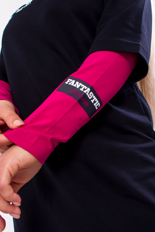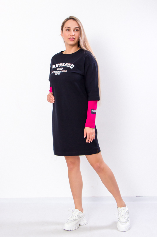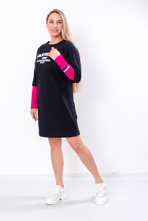 Жіноча сукня в спортивному стилі, пошита з однотонної двонитки. Сукня з округлою та довгими рукавами з імітацією подвійного рукава. Спереду сукня прикрашена стильним накатом. Таку модель можна поєднувати з кедами, кросівками або лоферами на тракторній підошві. Полотно гарної якості. Тому, при правильному догляді, сукню можна буде носити не один сезон. Може давати усадку після прання.