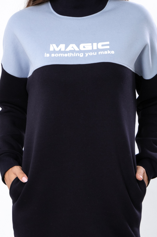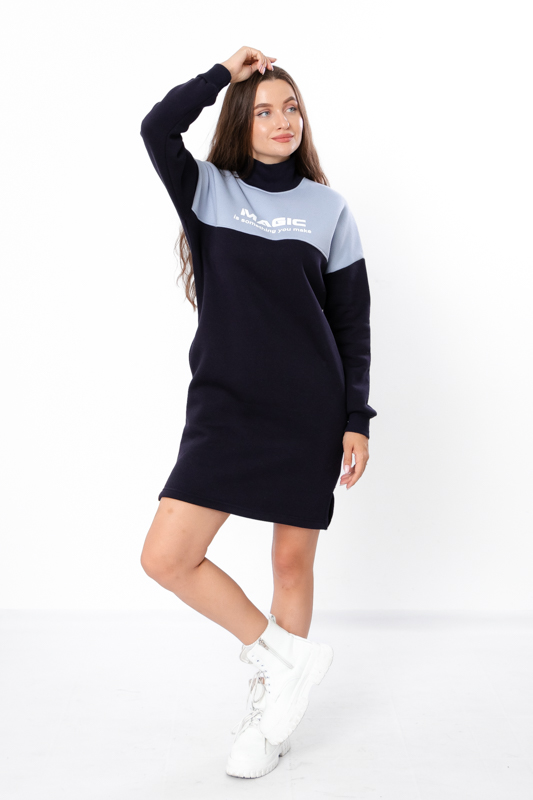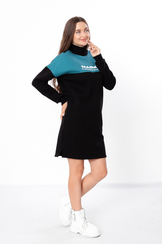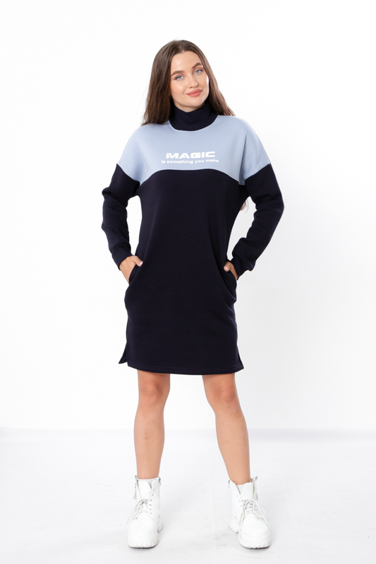 Стильна, сучасна сукня для жінок власного виробництва трикотажної фабрики ‘’Трикотажний Край’’, виготовлена з якісної, щільної тканини «тринитка з начосом». Дана модель прямого крою, має зручні приховані кишені, високий суцільний комір, два невеликих розрізи по бокам сукні. Завдяки необ’ємному крою, зручно одягати під куртку чи пальто. Щільна тканина з грустим начосом з виворотньої сторони чудово зберігає тепло, тому будьте певні – зимою ви будете зігріті одягом компанії «Трикотажний Край!»