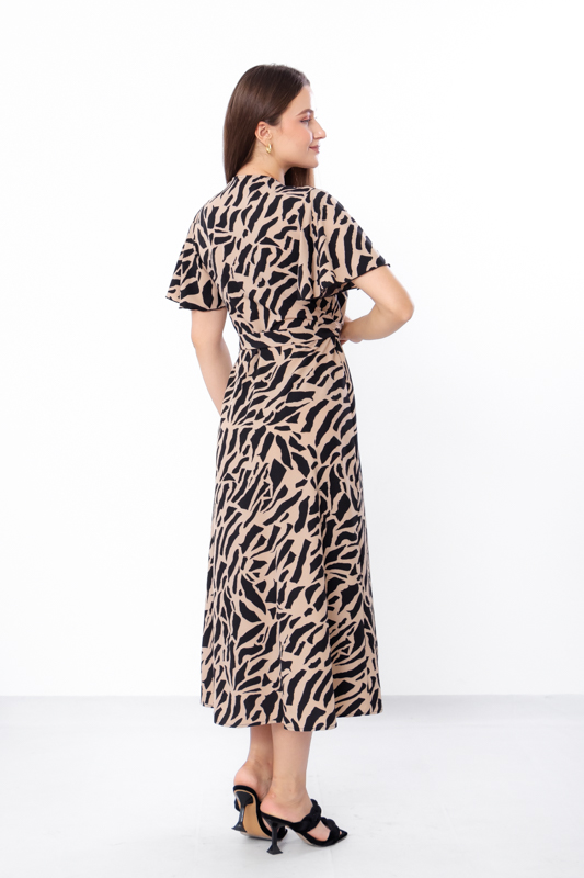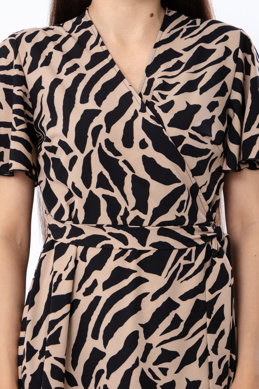 Класичний фасон із запахом створює гарну лінію декольте, а розкльошена спідниця додає легкості образу. Короткий рукав із м’якою хвилею прикриває плечі, візуально роблячи руки стрункішими. Сукня має довжину нижче коліна, що робить її доречною як для офісу, так і для вечірніх прогулянок або святкових подій.