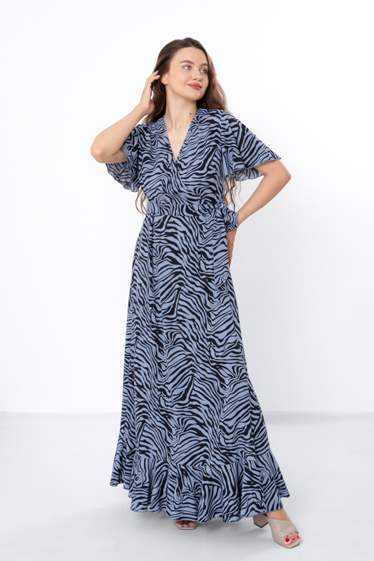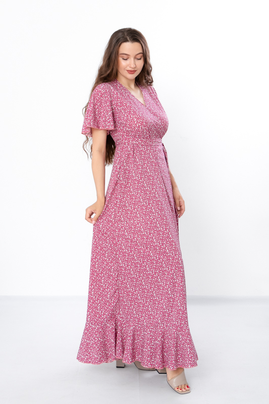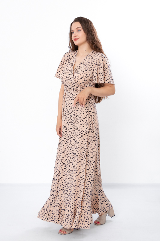 Сукня на запах, збоку зав’язується на поясок, має короткий вільний рукав та V-образний виріз.