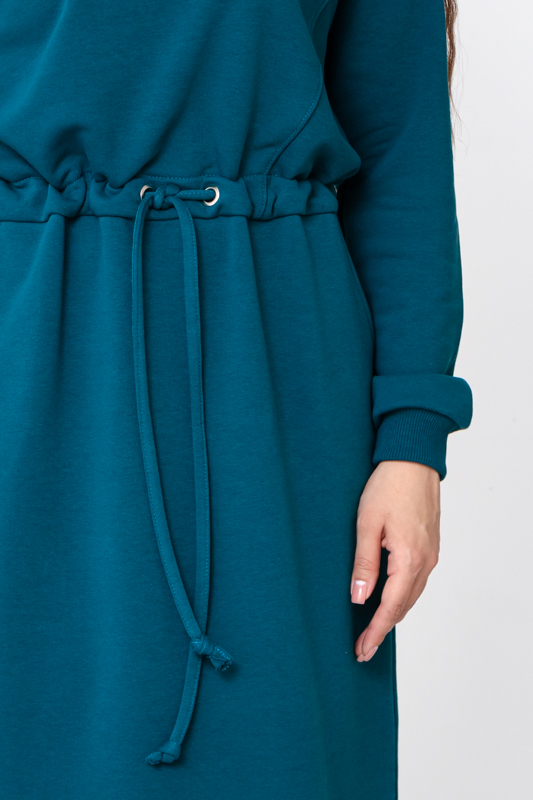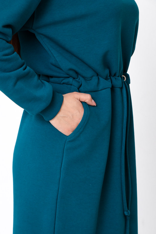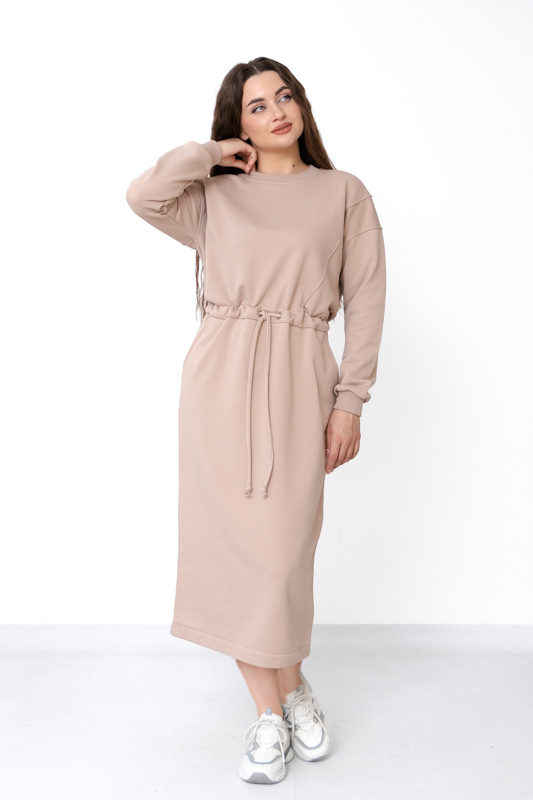 Фасон сукні прямого або злегка вільного крою забезпечує свободу рухів і гарно сідає на різні типи фігури. Особливу увагу привертає куліска на талії, яка дозволяє регулювати посадку та створювати більш жіночний силует. Довгі рукави зі зручними манжетами додають практичності та захищають від прохолоди. Кругла горловина виглядає лаконічно й універсально, завдяки чому сукню легко поєднувати з різним верхнім одягом — від жилеток і курток до пальта.